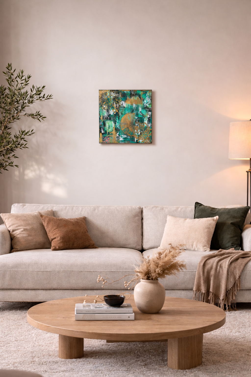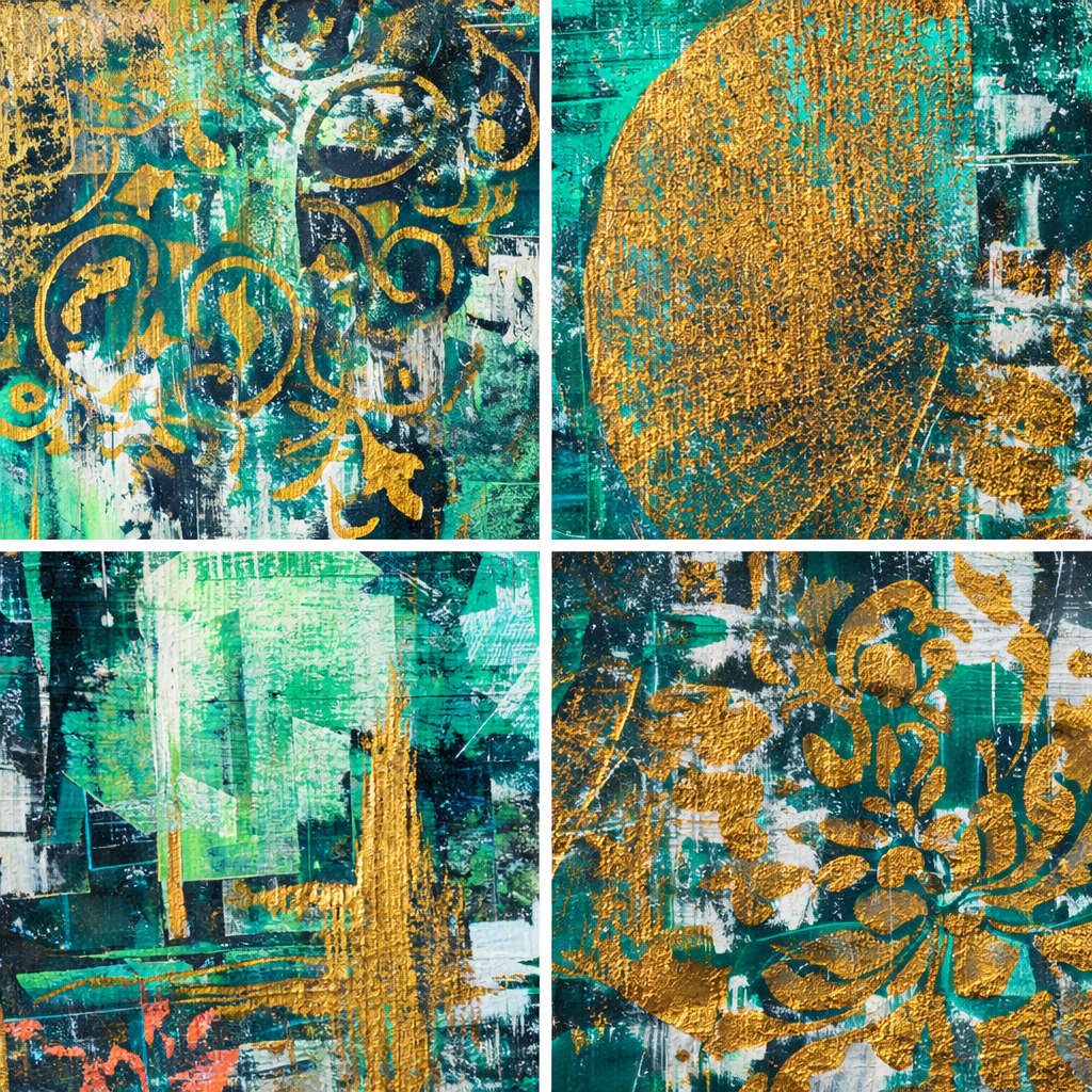 Composition abstraite vibrante où les verts profonds, les touches de turquoise et les éclats d’or se rencontrent dans un jeu de textures et de superpositions.
