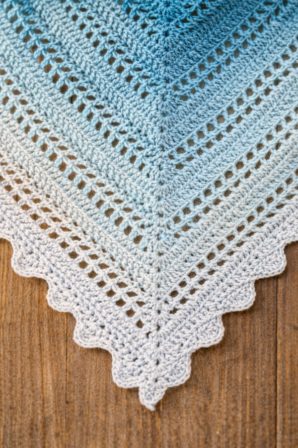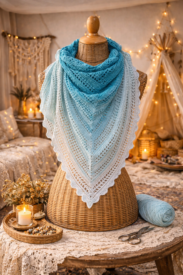 Ce châle triangulaire crocheté à la main séduit par son magnifique dégradé de couleurs allant du turquoise profond au bleu glacier. Ses mailles ajourées et délicates apportent légèreté et élégance, tout en mettant en valeur le travail artisanal du crochet.