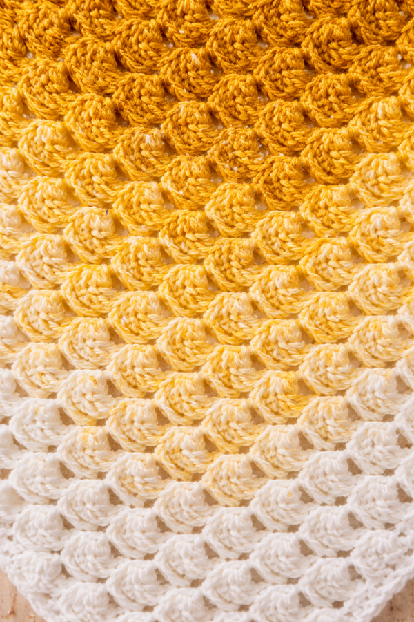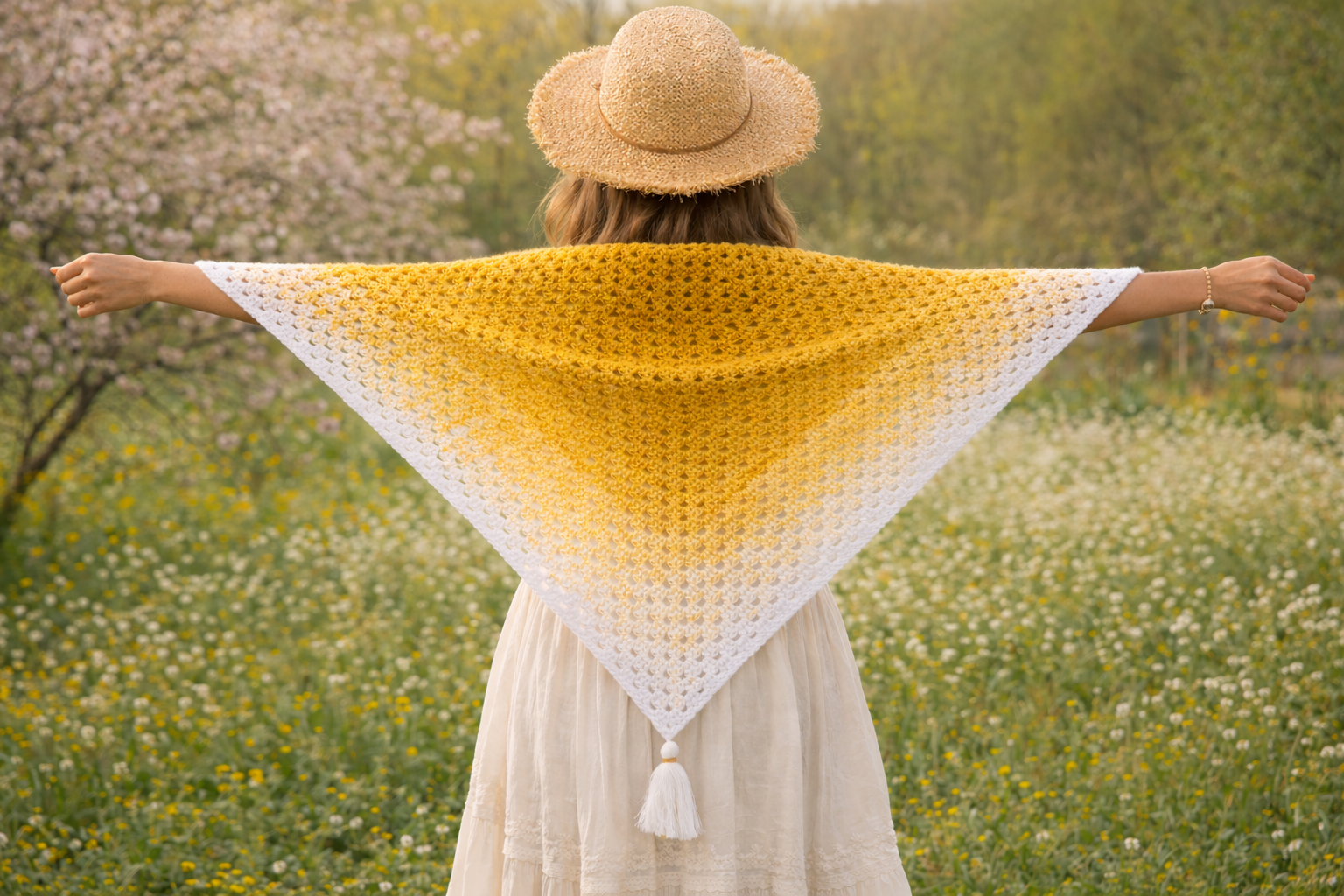 Ce châle au crochet se distingue par son magnifique dégradé de jaune doré vers un blanc doux, évoquant les premières lueurs d’une matinée printanière.