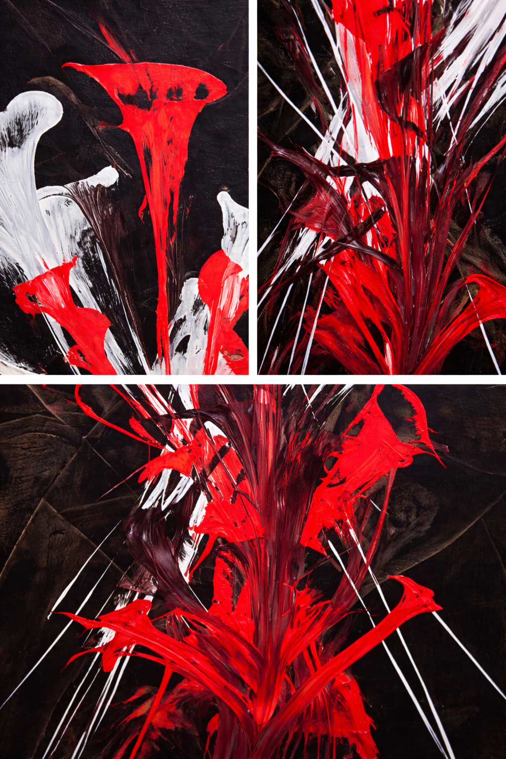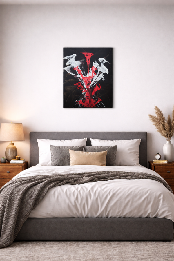 Composition abstraite où le rouge éclate comme une fleur en pleine expansion. Les formes blanches, contrastent avec la profondeur du fond noir et créent un mouvement presque organique.