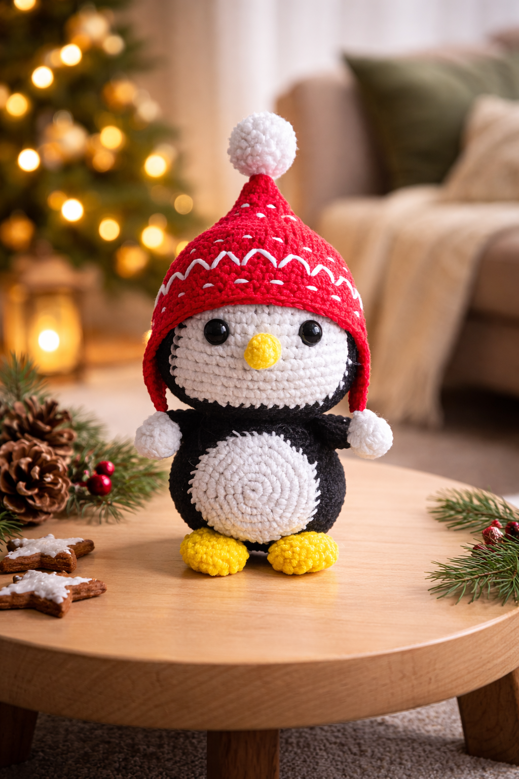 Craquez pour ce pingouin amigurumi fait main, une adorable création crochetée avec soin. Avec son bonnet rouge d’hiver et son pompon tout doux, ce petit compagnon apporte une touche chaleureuse et festive à votre décoration.